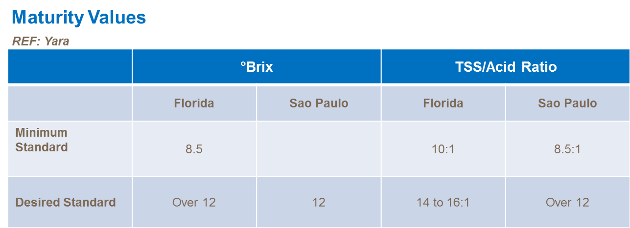 Le rapport SST/acidité donne une indication de la saveur du fruit (doux ou amer). Dans le cas des oranges, l'indice minimum de maturité varie au cours de la saison et selon le pays et la région.