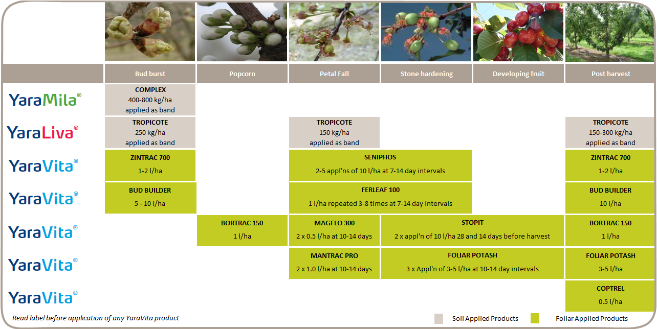Conçus par des spécialistes, les programmes de nutrition de Yara pour les fruits à noyau vous aident à obtenir des rendements exceptionnels. Cliquez sur l’image pour l’agrandir ou téléchargez le Programme de fertilisation les fruits à noyau au format PDF.