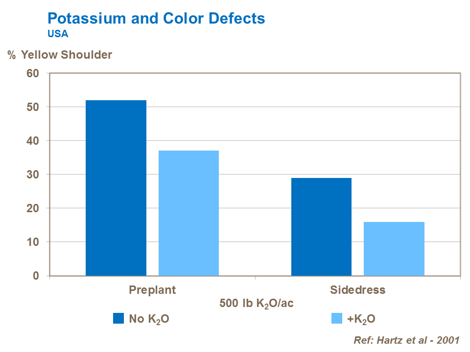 De faibles niveaux de potassium entraînent une réduction de la synthèse du lycopène et donc une mauvaise coloration des tomates.